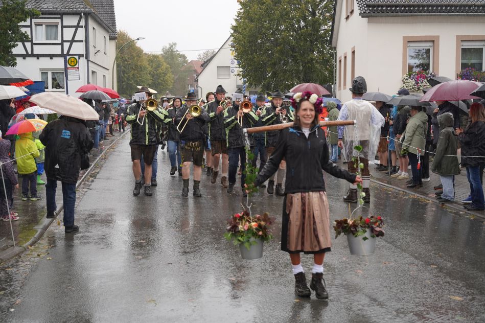 Eine besondere Ehre war es für uns, den großen Festzug musikalisch zu begleiten. Gemeinsam mit „Socke“ und Lea zogen wir – vorbei an mit Socken geschmückten Prozessionsfahnen und Rasseln – durch das festlich geschmückte Dorf in Richtung Schützenhalle.